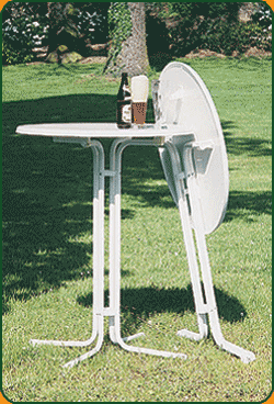 A hit: white, foldable standing table for little money, made from a glued chip board with Melaminharzbeschichtung and Polypropylenkante (protection edge) as well as an underframe made out of a powder coated steel.